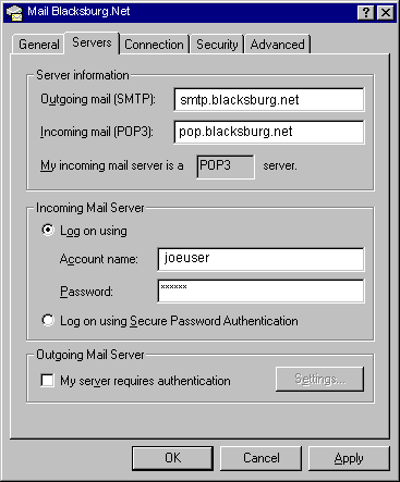 Click once on the blacksburg.net account, and push Properties button.